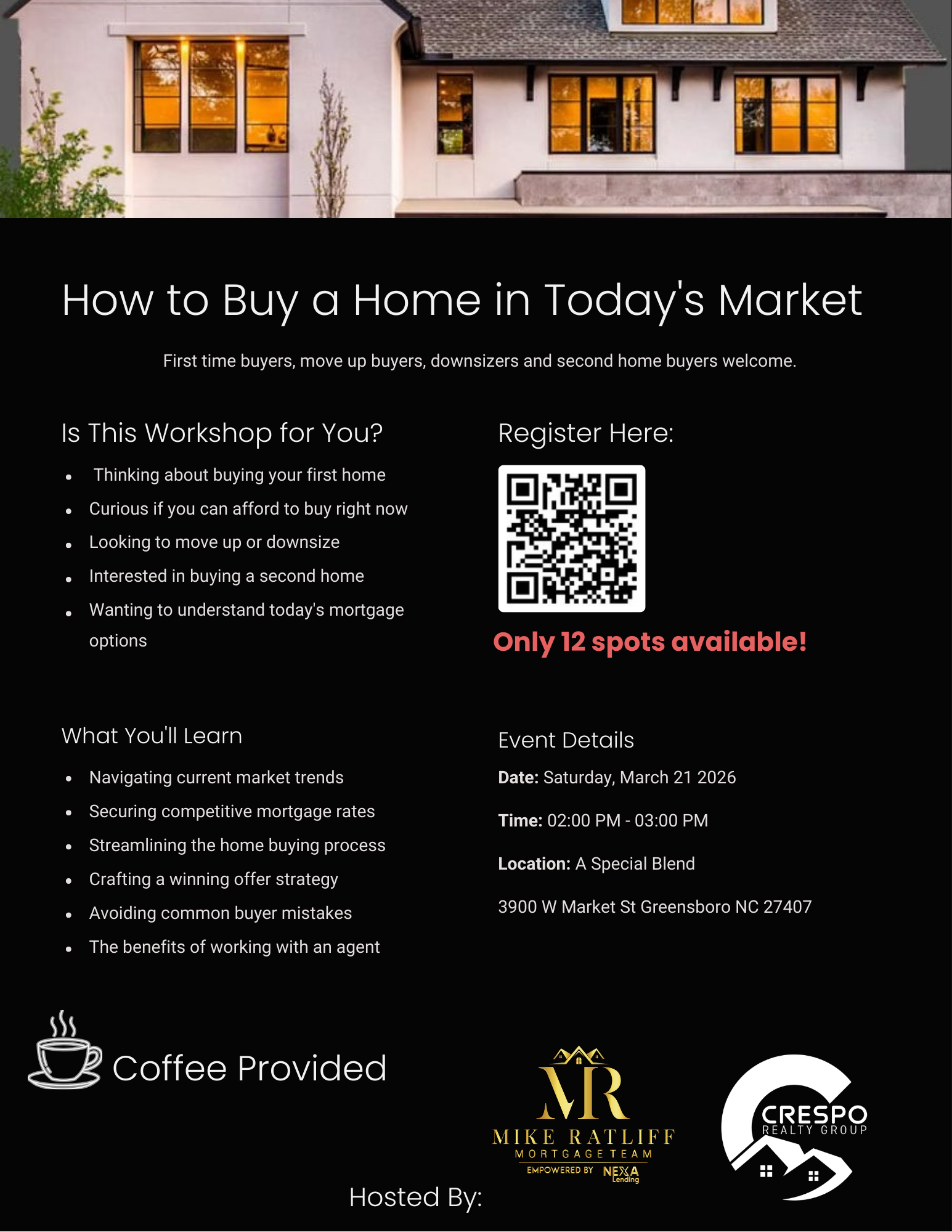HomeBuyer Workshop March 21stA Special Blend 3900 W Market St Greensboro NC Register Now Burlington, NCLexington, NC New Events Coming Soon: